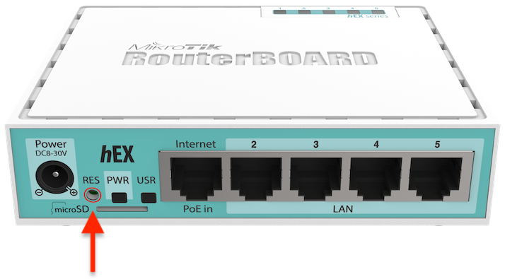 - Suelte el botón para restablecer la configuración de Routeros (alrededor de 5 segundos desde que alimentó el dispositivo)